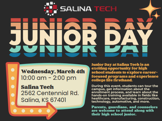 Salina Tech is excited to invite high school juniors to our upcoming Junior Day at Salina Area Technical College on Wednesday, March 4, 2026! This event is a great opportunity for students to explore our programs, tour our campus, meet instructors, and learn about technical education. The schedule is: